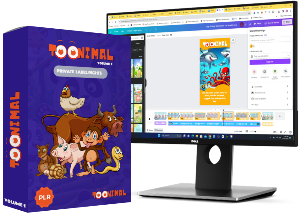 Toonimal is a collection of cartoon animated kids story videos with PLR (Private Label Rights) license. It features over 30 meticulously crafted stories showcasing animal characters, each accompanied by high-quality images, animations and professional voiceovers. These videos are fully editable and rebrandable, hosted securely within Canva for easy access and customization. Toonimal aims to provide engaging and entertaining content for children while offering marketers the opportunity to resell, rebrand and repurpose the videos for profit, with step-by-step training included and no complex software requirements!